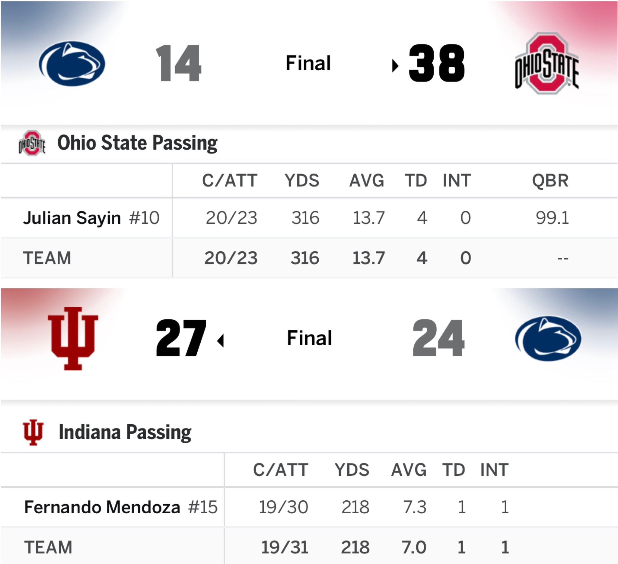 Julian Sayin is number 1 in the country in QB rating, #1 in the country in completion percentage, number 1 in 300 yard games, #4 in touchdown passes (in less games than #1 and #3), and that’s just this season. He’s also on pace to finish #1 in the history of college football in completion percentage, he’s got the best passer efficiency rating in the big ten since the turn of the century, and people’s knock on him right now is he hasn’t had to make any big throws because his team is winning by too much.