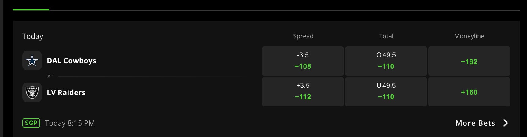 Tonight on Monday Night Football, the 3-5-1 Dallas Cowboys visit the 2-7 Las Vegas Raiders +3.5 (49.5).