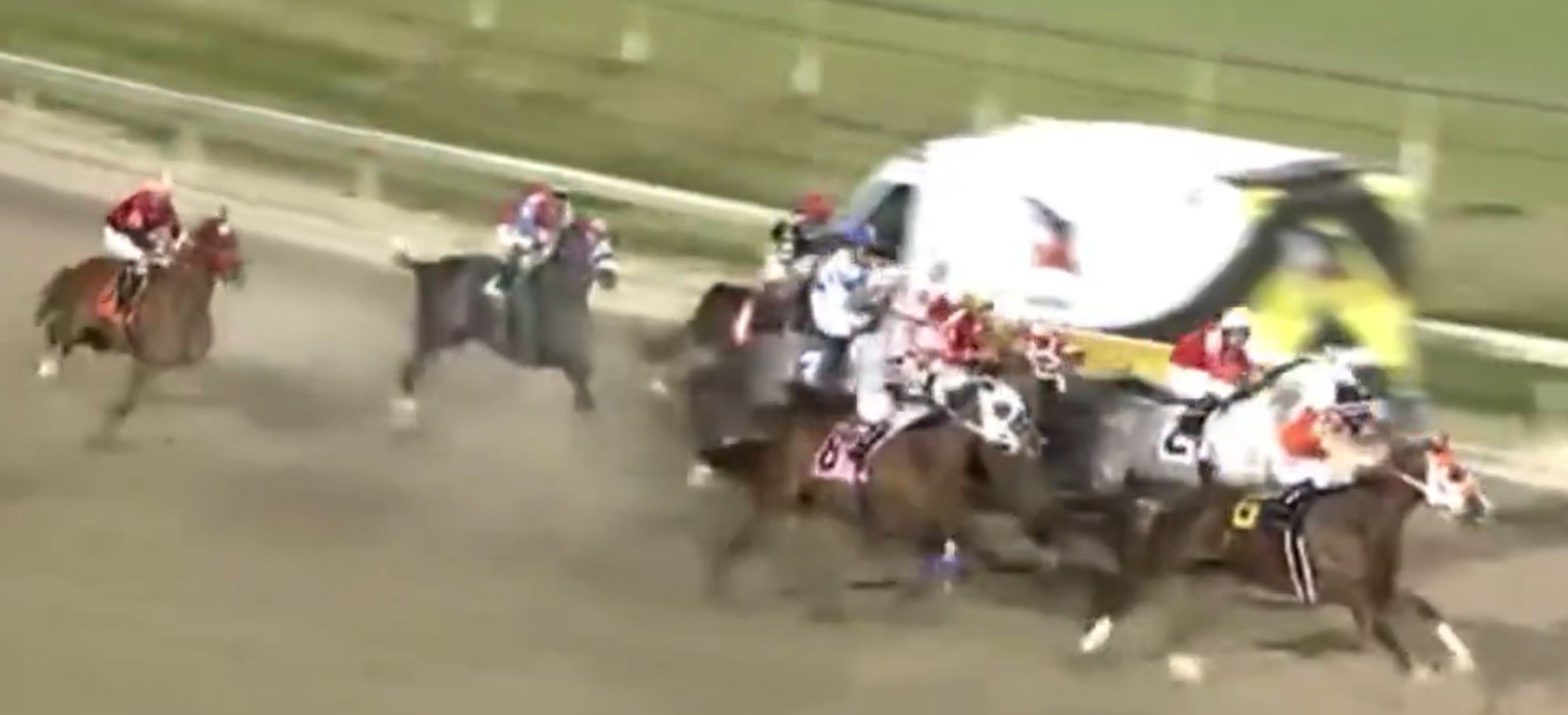 "A little tight there," said track announcer Rob Tuel as the horses and jockey were dodging the oncoming vehicle.  Ya think???