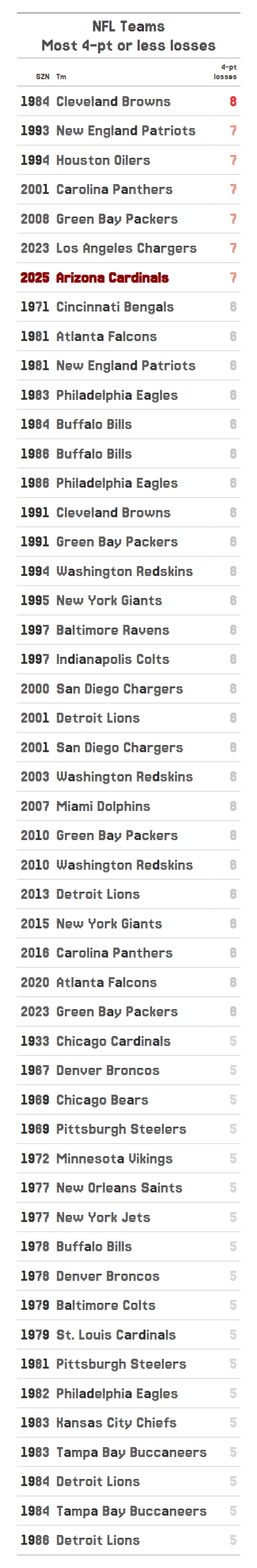 Sad Stat #4 (points or less): The Cardinals are now one game away from the 1984 Cleveland Browns for most games lost by four-points or less