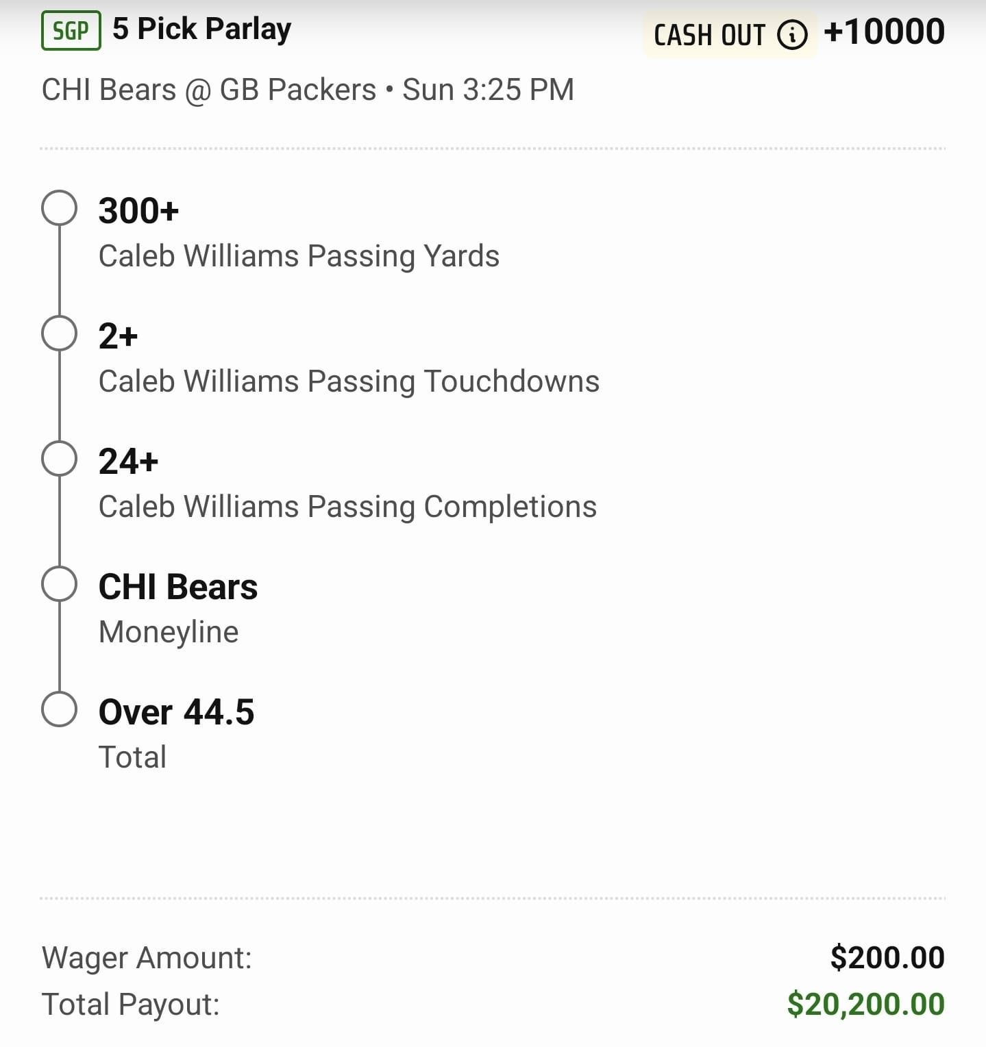 Get ready for some homer wish casting. What if this is the week Caleb Williams throws 70 percent for the first time in 2025? I've been a big critic of his lately, but hear me out (always a good sign when you start an argument with hear me out). This is the biggest Bears game since the double-doink. Not great that Rome Odunze is now out. But Caleb Williams might be more than just good in the clutch. He might have Green Bay's number. Out of the five games he's connected on 70% of his passes, two of them were against the Packers. That means both were with either Matt Eberflus or the carcass of him.