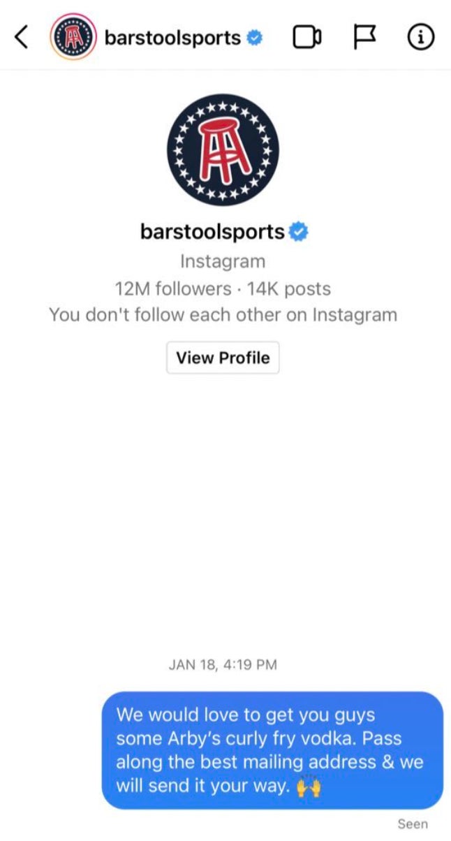 … Arby's reached out to the main account BUT all DM's go directly to Tommy Smoke's phone so he can keep in contact with Local Smokeshows. The man works 24/7, but must have missed it. If only Arby's would have seen our DM earlier. Oh, well … REAL Curly Fry Vodka coming soon to Lowering The Bar … which means, more Drunk Vibbs. Can't wait.